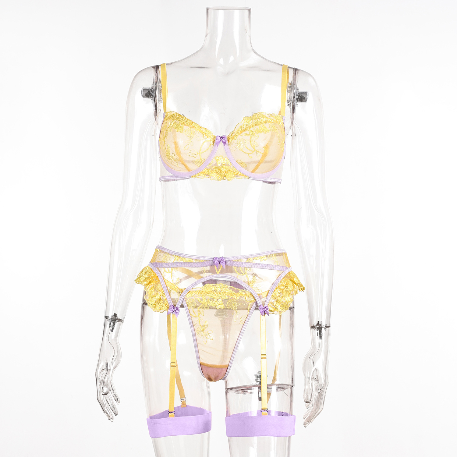 Uniform code Deep Love Private Label Sexy See-Through Revealing Glossy Purple Band Yellow Embroidery Lingerie Underwear Set