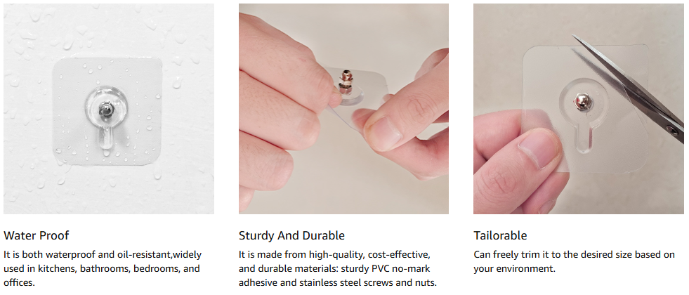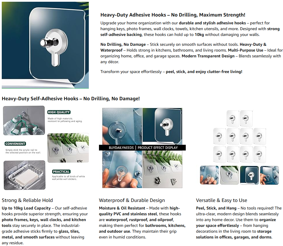 - HEAVY DUTY ADHESIVE HOOKS- self-adhesive, Great for hanging shower and bath accessories, can hold umbrellas, scarves,towels, robes, bags, coats, keys, purses and baseball caps,dog leashes etc.